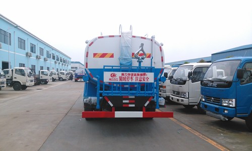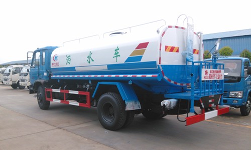 上裝配置:罐體采用4mm厚武鋼集團供應的罐車專用板材制作,罐體容積:15立方;罐內防浪隔板具有防波作用,減低罐內液體的沖擊。配備國內知名品牌日本技術大功率灑水車專用水泵,可自吸自排,引水時間<10min,流量60m3/h,揚程90米。東風天龍灑水車其它專用部分標配為:前沖、后灑、側噴、后工作平臺、360度可調節綠化水炮,垂直吸程≧7米,灑水寬度≧16米,綠化水炮射程≧35米,自流閥、濾網、消防接口(可連接消防栓取水,可作應急消防用)。罐前量管(觀察罐內水位)、罐后爬梯、罐上罐口帶簡易護欄、罐側雙炮筒、3米長4寸鋼絲塑膠管兩根,罐體表面雙層油漆工藝,防銹、耐腐蝕,其余有廠家標配。