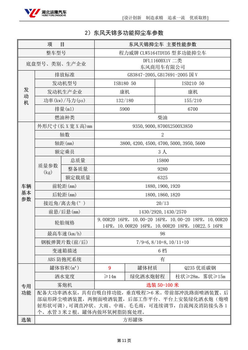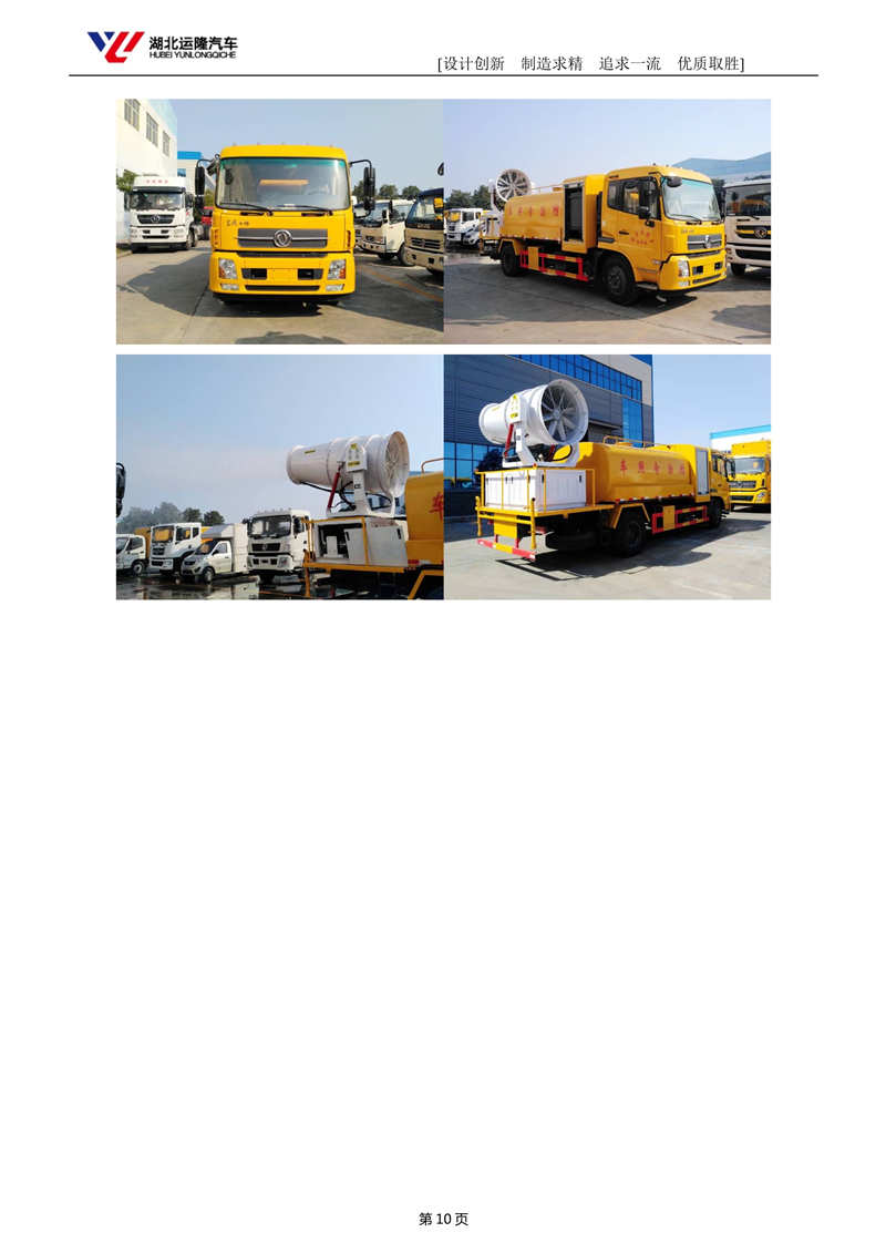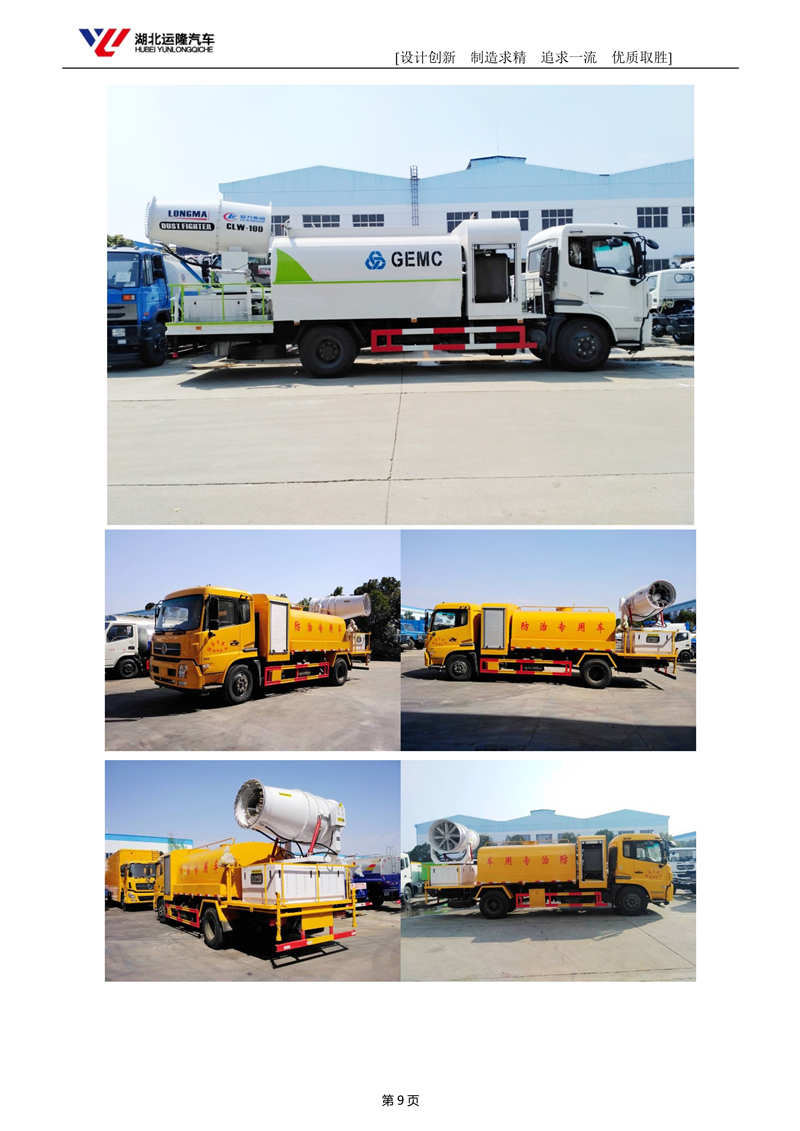 上裝配置:罐體容積為 10-12 立方多功能抑塵灑水車,選配風(fēng)送式霧炮機組射程50米、60米、80米,罐體鋼板為4mm碳鋼Q235材質(zhì),罐內(nèi)隔板具有防波作用,以減輕汽車行駛時罐體液體沖擊,罐體及整車外形尺寸按照公告。帶大功率專用灑水泵,泵可自吸自排,整車前沖、后灑、側(cè)噴、帶65消防接口,后平臺配CLW-50、CLW-60、CLW-80型風(fēng)送式霧炮機組;罐體前封頭配大功率柴油發(fā)電機組;遠程遙控系統(tǒng)控制;霧炮自動旋轉(zhuǎn)角度0-360°。后平臺帶綠化灑水炮,灑水炮可全方位旋轉(zhuǎn),可連續(xù)調(diào)成直沖狀、大雨、小雨、毛毛雨;前封頭帶水位計,后平臺主管路帶1寸澆花接口,后爬梯。帶兩根輸水管及陰陽端。罐體顏色:白/蘭,罐體兩側(cè)噴“多功能抑塵車”字樣,貼反光標示。